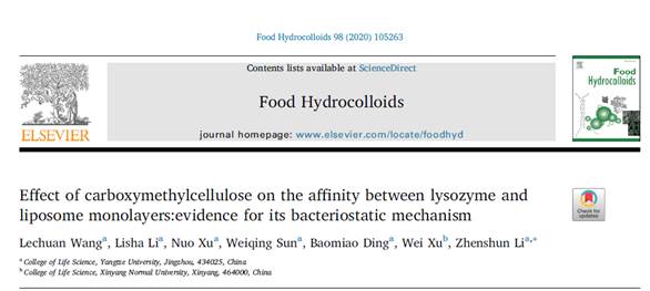 (通讯员 张欣)3044永利2017级食品加工与安全专业硕士研究生汪乐川在李真顺博士的指导下于2019年8月在《Food Hydrocolloids》期刊以第一作者在线发表了一篇题名为“Effect of carboxymethylcellulose on the affinity between lysozyme and liposome monolayers:evidence for its bacteriostatic mechanism”(DOI: 10.1016/j.foodhyd.2019.105263)的学术论文,该期刊为农业学科SCI收录的一区期刊,影响因子5.839(2018年)。该论文为汪乐川的研究生课题内容,也是李真顺老师的国家自然科学基金项目“羧甲基纤维素调控溶菌酶抑菌活性的分子机制”的部分研究内容。