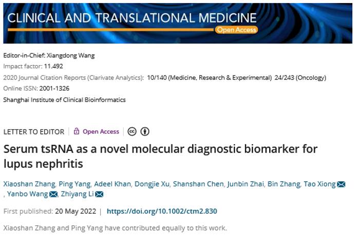 2022520日,3044永利熊涛教授团队和南京鼓楼医院医学检验科李智洋研究员团队合作,在影响因子为11.492的高水平期刊Clinical and Translational Medicine在线发表了题为《Serum tsRNA as a novel molecular diagnostic biomarker for lupus nephritis》的文章。该文分析了狼疮性肾炎(lupus nephritis, LN)血清中tsRNA的表达谱,首次筛选到LN组中显著高表达的tRF-Ala-AGC-2-M4,并对其诊断价值和分子功能进行了评估和预测。团队成员研究生张孝山和南京鼓楼医院医学检验科杨平主管技师为共同第一作者,熊涛教授为本文的第一通讯作者。