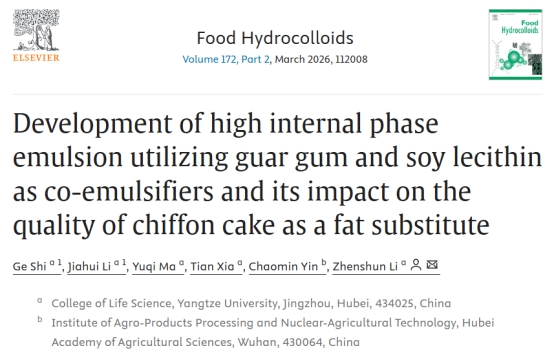 近日,我院食品高分子团队在食品领域Top期刊《Food Hydrocolloids》(IF=12.4,中科院一区)上发表了题为“Development of high internal phase emulsion utilizing guar gum and soy lecithin as co-emulsifiers and its impact on the quality of chiffon cake as a fat substitute”的学术论文。团队负责人李真顺教授为论文通讯作者,论文第一作者为食品科学与工程专业2023级硕士研究生史歌,3044永利为第一作者和通讯作者单位。