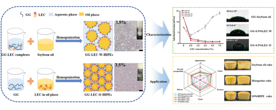 在健康饮食理念日益普及的背景下,高内相Pickering乳液(HIPEs)因其能模拟传统固体脂肪(如人造奶油)的质地,并富含不饱和脂肪酸而备受研究人员关注。多糖通常具有良好的化学稳定性,但其乳化能力有限,常需与其他乳化剂复配使用以提升乳化效果。然而,现有研究多集中于多糖在水相中的界面行为,所制备的乳液在质地和稳定性方面仍难以满足食品加工的实际要求。本研究将天然多糖瓜尔胶(GG)和大豆卵磷脂(LEC)作为共稳定剂同时分布于水油两相,制备HIPEs。通过在界面处双向吸附来提高乳液的稳定性,突破传统单一水相稳定剂的局限。结果表明,当LEC浓度处于3.5%–7.5%范围内时,油相中的LEC与水相中的GG产生协同作用,所形成的乳液稳定性好,并呈现固态结构。在戚风蛋糕应用中,仅添加10%的HIPEs(23克)即可替代原配方中15%的人造黄油(35克)。新型蛋糕品质与传统产品相当,不仅显著降低了饱和脂肪酸含量,还有效延缓了贮藏过程中淀粉的老化速率。该研究为多糖基HIPEs在蛋糕中的应用提供了新思路。