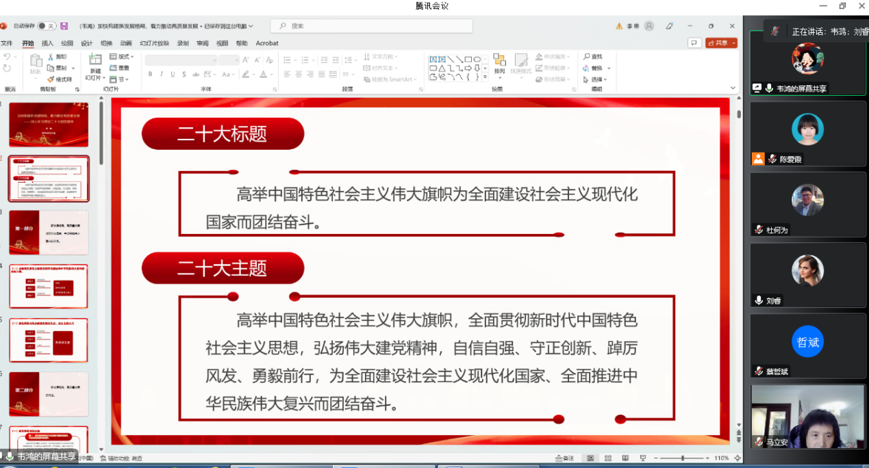 (通讯员 陈爱霞)为深入学习贯彻党的二十大精神,2023年1月4日上午,学院组织学习贯彻党的二十大精神宣讲会,邀请学习贯彻党的二十大精神长江大学马克思主义宣讲队成员、长江经济带发展研究院院长韦鸿教授作“加快构建新发展格局,着力推进高质量发展”为题的宣讲报告,全院教职工参会,学院党委委员杜何为主持宣讲会,会议以线上方式进行。