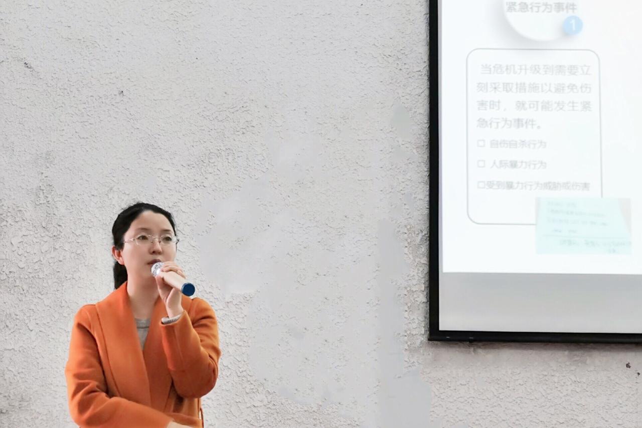 范昆琨老师以认识自己为开篇,分别从心理危机、危机识别、危机干预三部分详细介绍了如何在班级中开展心理工作,以案例的方式娓娓道来讲解了大学生常见的心理危机,她提到:“心理危机分为三种不同阶段,一是一般心理困扰,二是心理障碍阶段,最终表现为心理疾病。抑郁情绪并不等同于抑郁症,抑郁症表现为心理症状加生理症状,一个正常人的情绪会保持相对稳定,但偶尔也会有抑郁的心情。”在培训中,范老师对新生骨干详细讲解了在日常生活中如何发现危机、发现后该怎样对待危机问题,列举了13种大学生心理危机问题高发人群,希望新生骨干以认真负责的态度,主动关心身边的同学,提高工作的敏感性,备有一只关爱的眼,及时地识别危机,帮助高关怀学生走出危机,实现自我成长,做到有效自助和互助。