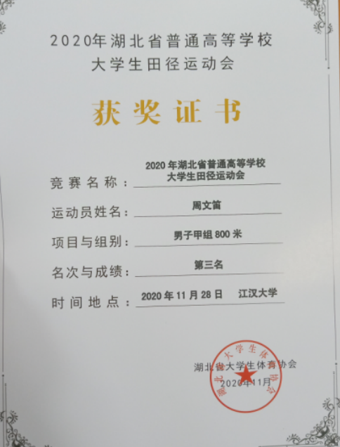 (通讯员 范昆琨)11月28日至29日,由省教育厅主办,湖北省大学生体育协会、江汉大学承办的2020年湖北省大学生田径运动会在江汉大学举行。在两天的比赛中,我院代表生科类32005班周文笛奋力拼搏,取得了甲组男子800米第三、400米第四的骄人成绩。