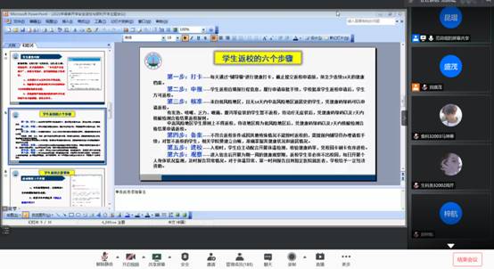 各年级辅导员老师在本年级主题班会上传达了学校春季返校工作方案,从学生来校前的准备、来校途中注意事项、进校流程、到校后的健康观察、学风建设五个层面进行了详细讲解,诸如“返校要申请审批”、“需连续健康打卡满14天”以及“返校途中注意自我防护”等,强调了返校后学生在生活、学习和活动等方面的注意事项,比如要坚持健康打卡,非必须不出校等等,并针对学生提出的问题予以了解答。