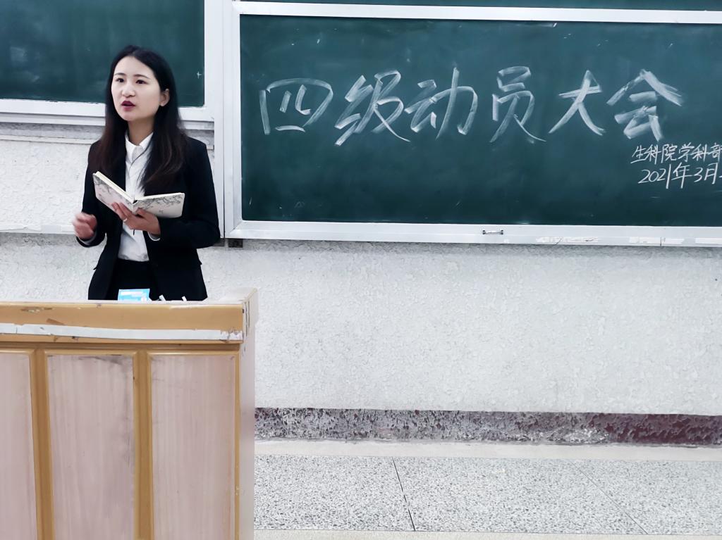 大会伊始,范老师强调了英语四级的重要性,让同学们对四级重视起来。鼓励大家备考要有计划、有方法、有信心,并寄语同学们:“希望每个同学都能顺利通过英语四级,考个高分。”生科院大二学生别致、王睿、李俊慧和大四学生张伟基与同学们进行了现场交流,分享了学习英语的有效方法。
