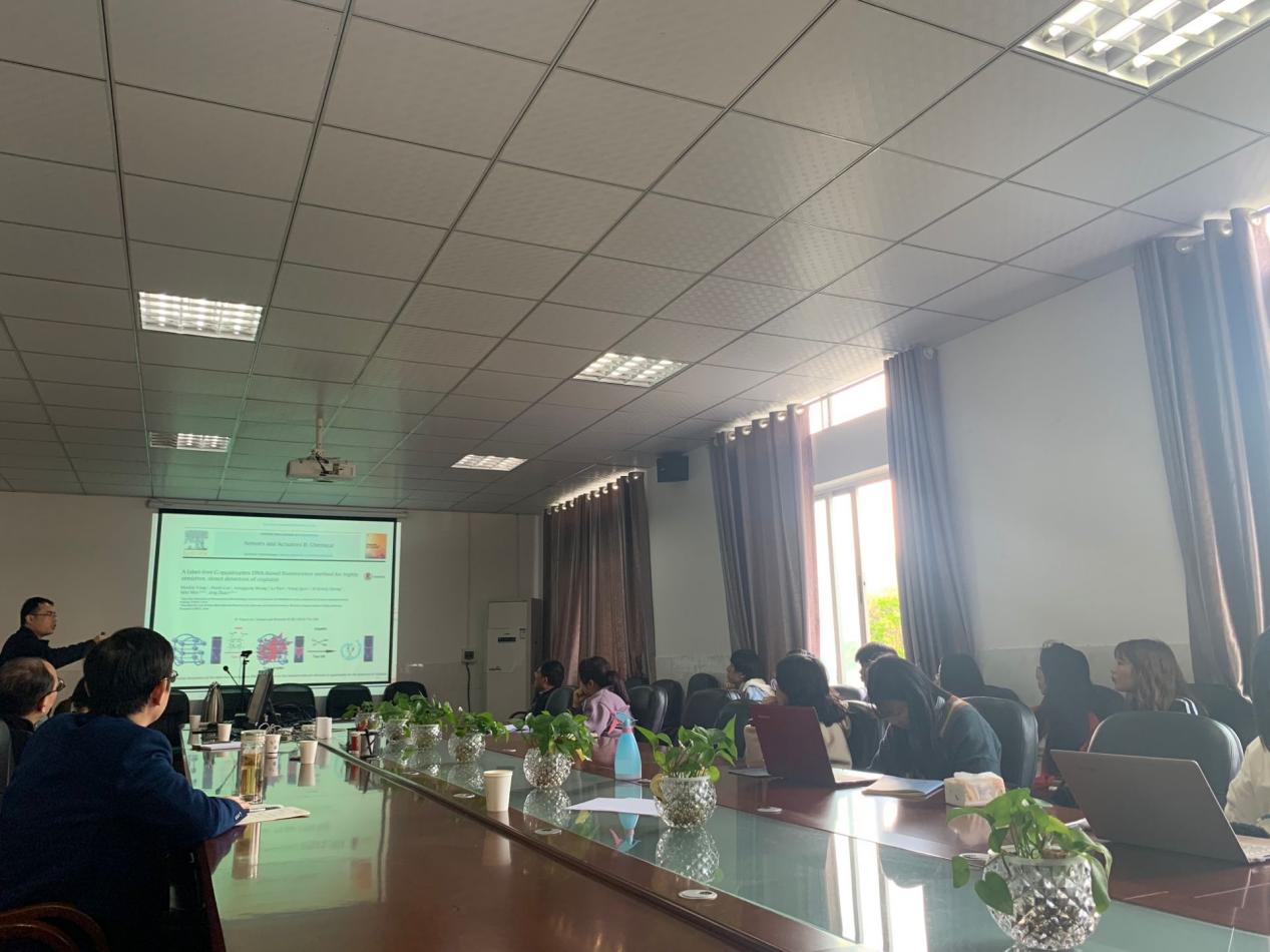 杨华林副教授从环境中的污染物及其危害为引,介绍了当前环境重金属检测的必要性,并汇报卟啉及卟啉金属化的过程、DNA酶催化卟啉金属化的优越性及检测机理。杨教授专业的讲授让现场师生都认识到当前环境问题的严峻形势,重金属检测的必要性以及检测方法的先进性,坚实科技指导生产创造健康美好生活的信心和决心。
