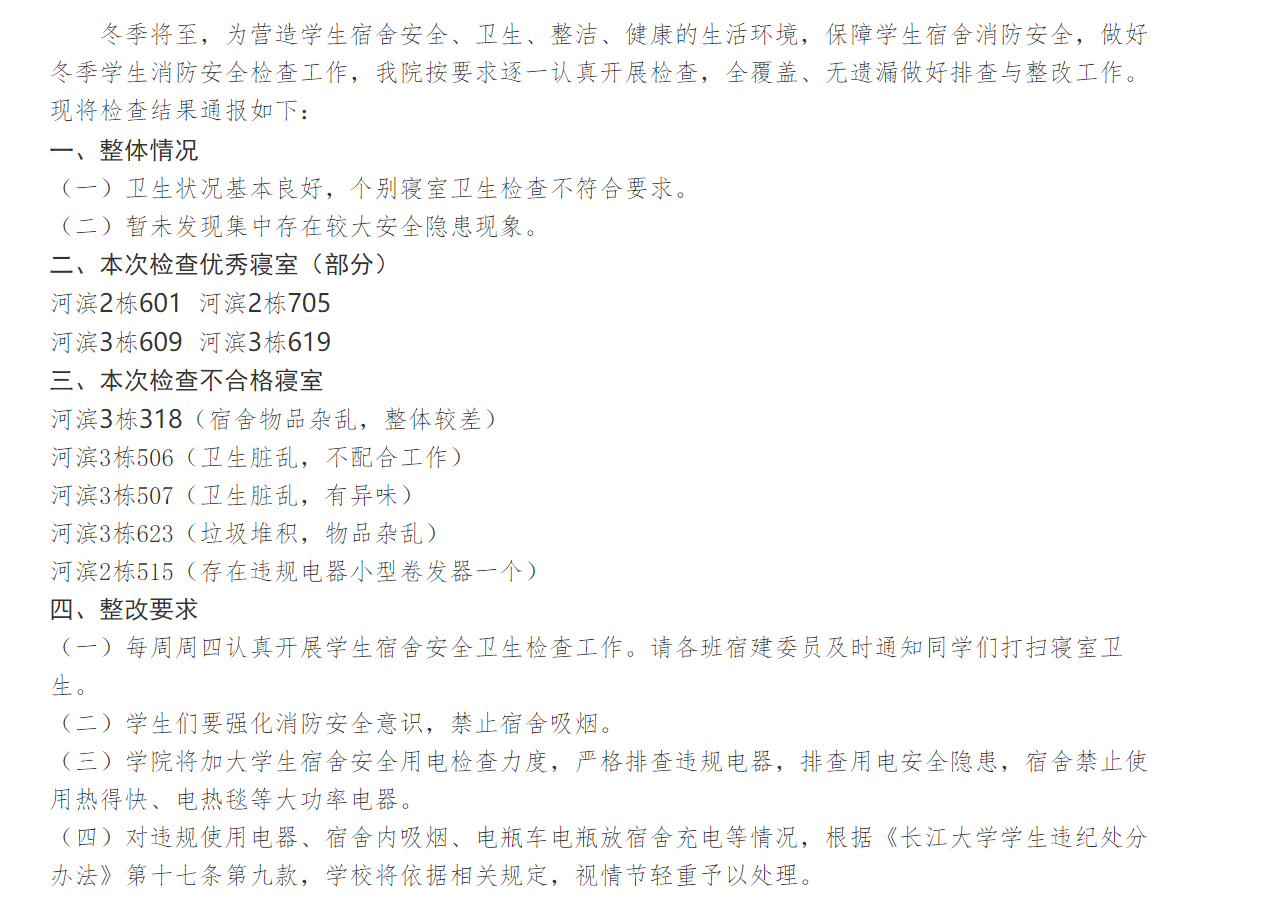我院高度重视学生宿舍冬季消防安全隐患排查工作,党委副书记汪萍组织领导,各年级辅导员、主要学生干部深入学生寝室进行安全排查整改。此外,我院各班召开安全会议,组织全体同学集中观看长江大学安全教育平台消防安全专题视频,认真学习消防安全知识,确保各年级各班级无一遗漏。其中,20级辅导员范昆琨老师在进行走访时重点强调了冬季寝室生活安全用电的重要性,要求同学们遵守校纪校规,严禁在寝室使用违规电器,这不仅仅是对自己的负责,更是对宿舍同学的保护。