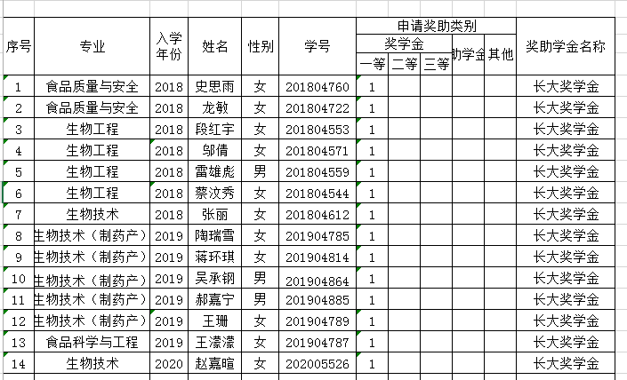 根据《长江大学普通本科生奖助学金管理办法》要求及有关文件精神,结合我院实际情况,经学生本人申请、学院奖助学金评审小组审核、学院党政联席会通过,现将14名初评名单公示如下: