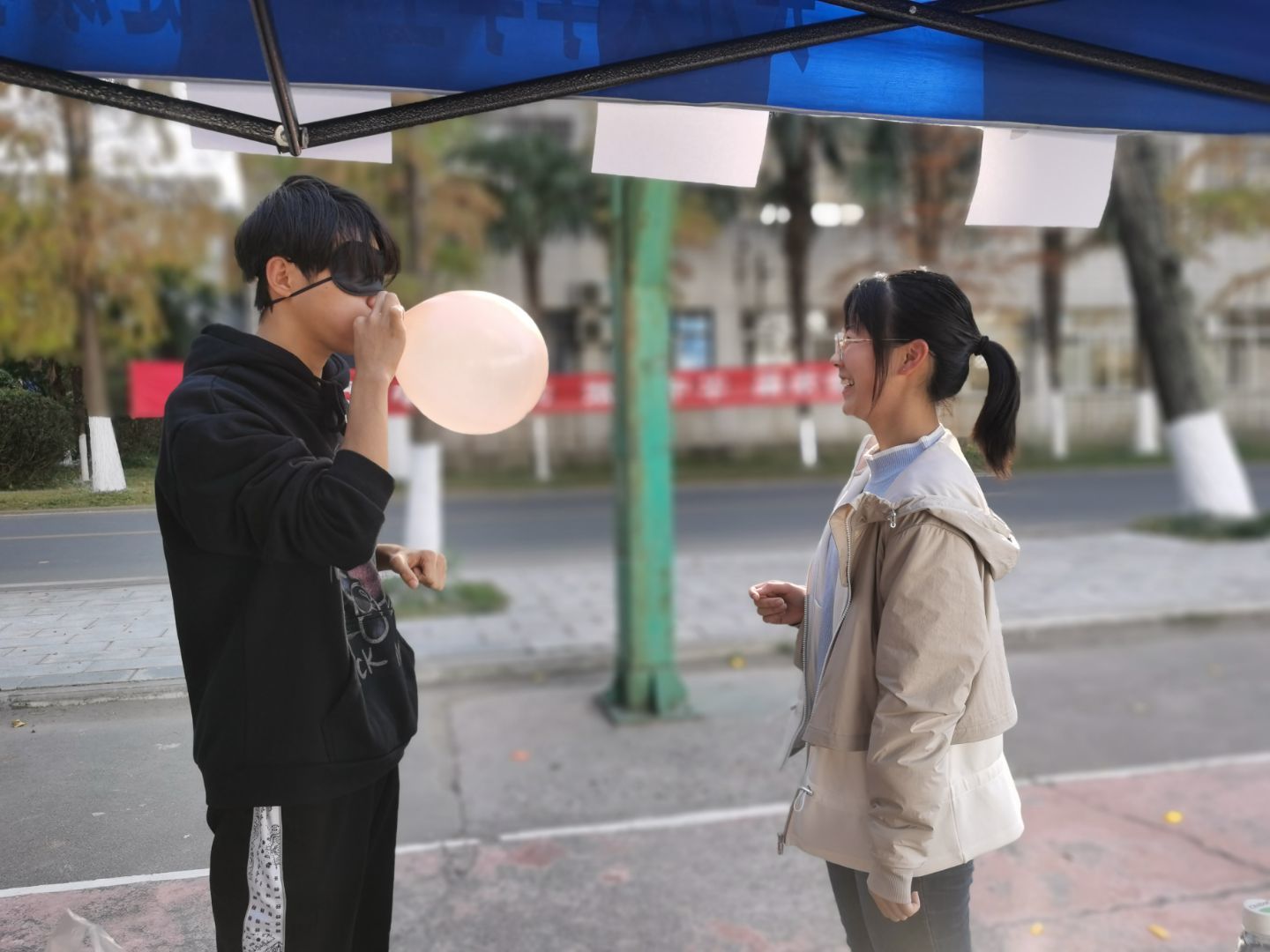 活动在主持人的开场白中拉开帷幕,主持人向大家介绍了游戏规则:学生先分成五组玩报数游戏,选择或随机分配搭档,两人一组,一人先带上眼罩,另一人充当搭档的“拐杖”,共同进行盲眼摸瓶、心手相通等六个游戏环节,所有游戏完成后回到起点进行抽奖获得小礼品。整个活动过程中,每组成员都齐心协力共同完成这些游戏。同组成员配合默契,顺利完成三个任务之后,寻找角色转换点互换游戏身份,马不停蹄继续进行后三个环节的游戏。活动最后由院团委学生会主席团成员为活动获胜者颁发奖品,全体人员拍照留念。