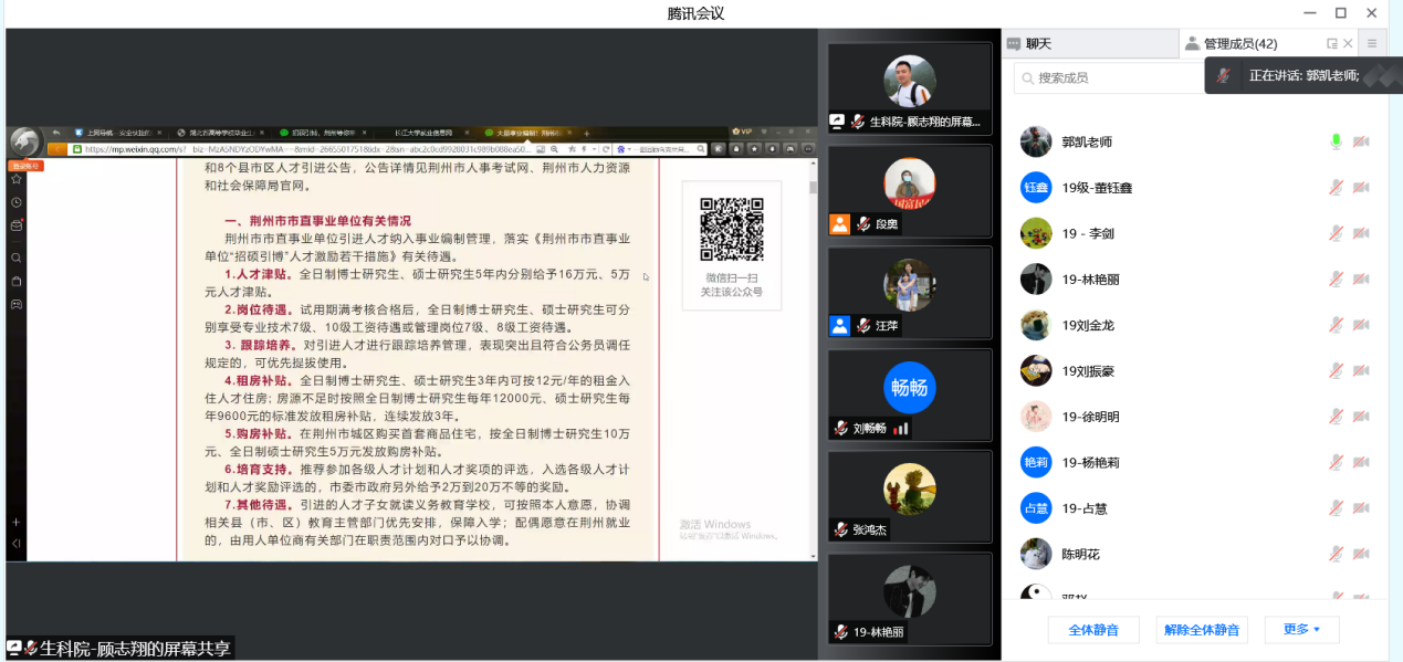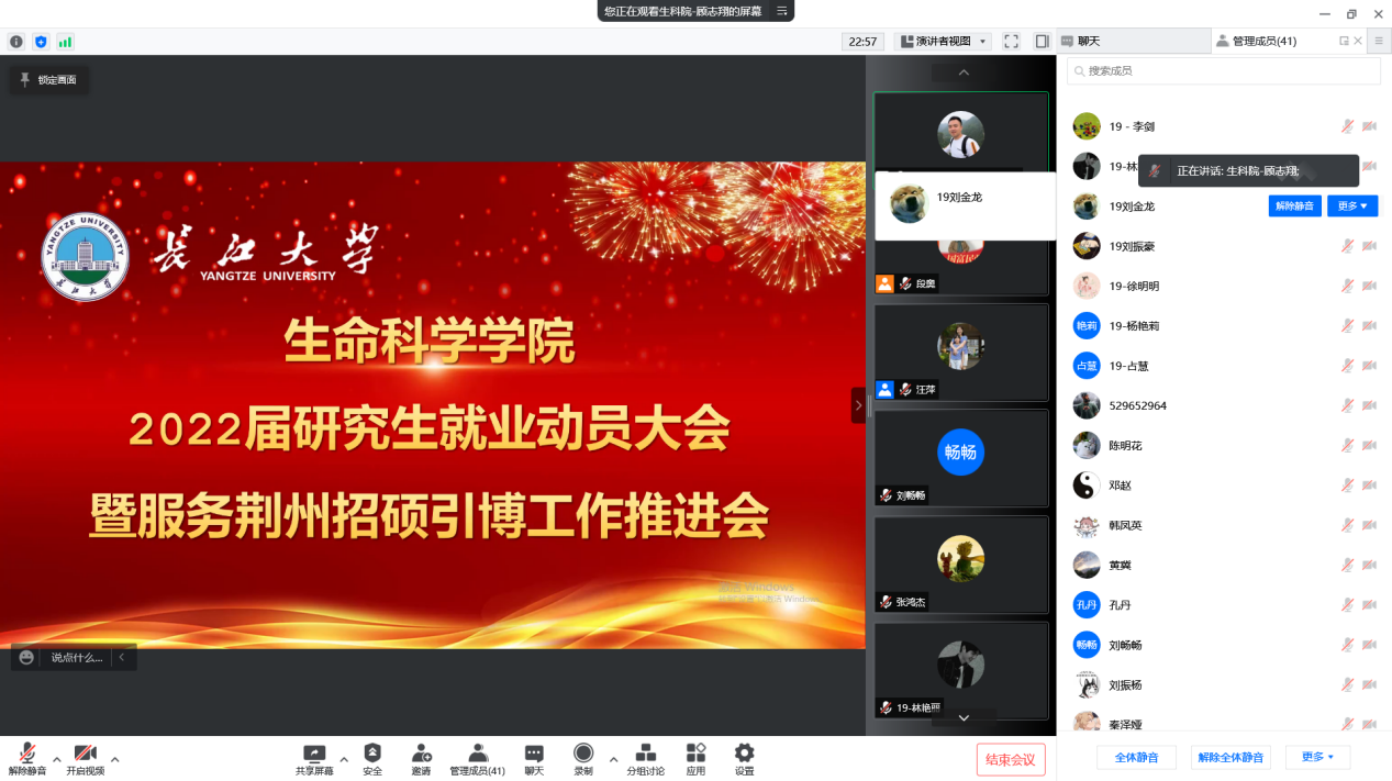 (通讯员 顾志翔 段奥)为贯彻落实长江大学服务荆州招硕引博工作推进会相关精神,进一步优化生命科学院2022届研究生的就业服务及管理工作,促进高质量就业氛围的形成。我院于2022年2月24日下午顺利召开2022届研究生就业动员暨服务荆州招硕引博工作推进会议。根据疫情防控政策要求,本次会议采用腾讯会议方式线上召开。会议由党委副书记汪萍主持,研究生辅导员顾志翔,就业专干郭凯进行宣讲,全体2019级研究生参加。