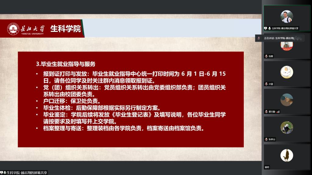 会议伊始,顾志翔老师从疫情防控、防溺水、防诈骗、防火、毕业季饮酒等方面对同学进行相关安全教育,倡导同学珍惜在校时光,不要在最后时刻放松警惕。随后,顾志翔老师详细地讲解了毕业生离校各项手续的办理要求及时间节点,帮助同学们梳理离校手续的顺序脉络。最后,汪萍老师强调此时正是同学们人生的关键节点,希望同学们高度重视离校相关手续的办理,妥善处理好所有手续后再离校。祝愿同学们前程似锦、一帆风顺,母校永远欢迎大家回家。