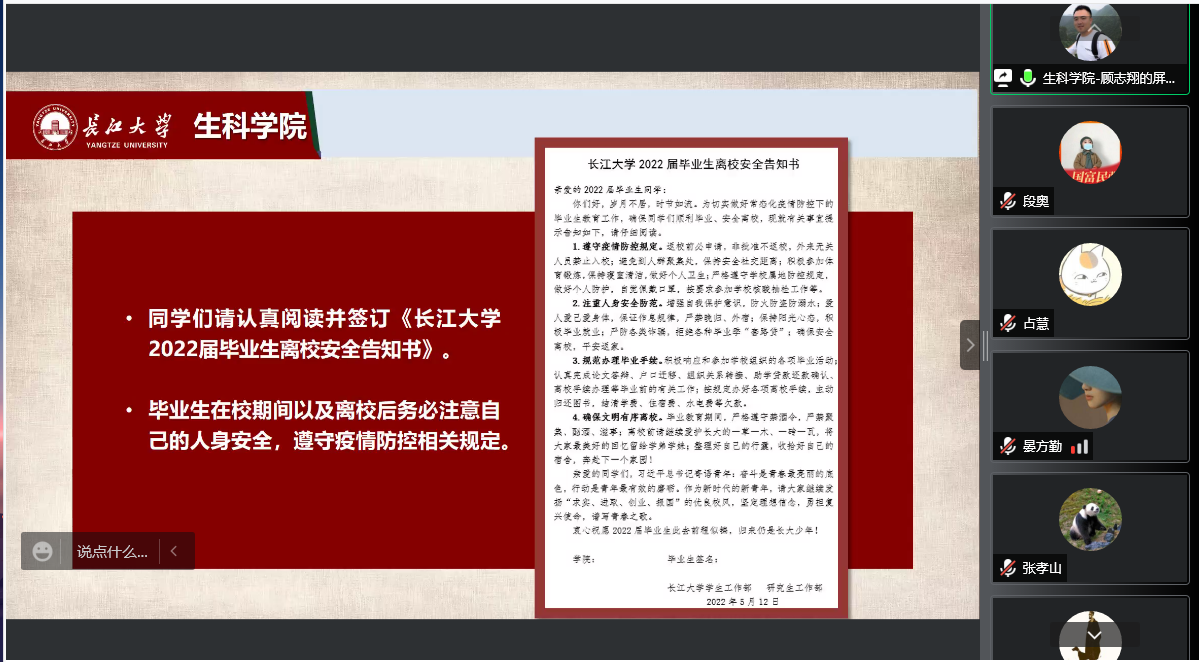 (通讯员:段奥 顾志翔)根据相关工作要求,为保障2022届硕士研究生顺利毕业离校,3044永利于2022年6月4日开展了硕士毕业生疫情防控、安全离校教育主题班会。本次会议由党委副书记汪萍主持,研究生辅导员顾志翔及全体2022届研究生参加。