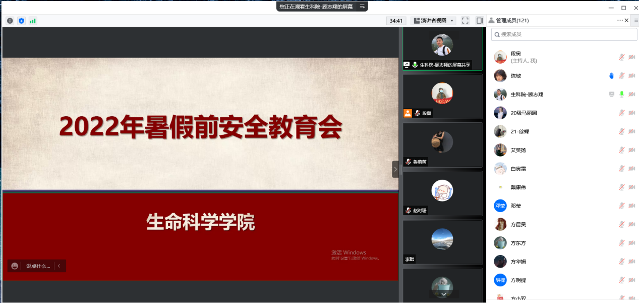 会议伊始,顾志翔老师向同学们传达了习近平总书记关于安全生产重要论述的精神,随后一起学习《生命重于泰山》电视专题片,从疫情防控、防溺水、防诈骗、防火、毕业季饮酒、心理健康等方面对同学进行相关安全教育,强调了暑假安全重要性。最后,顾志翔老师详细地讲解了暑期离校返校各项手续的办理要求及时间节点。