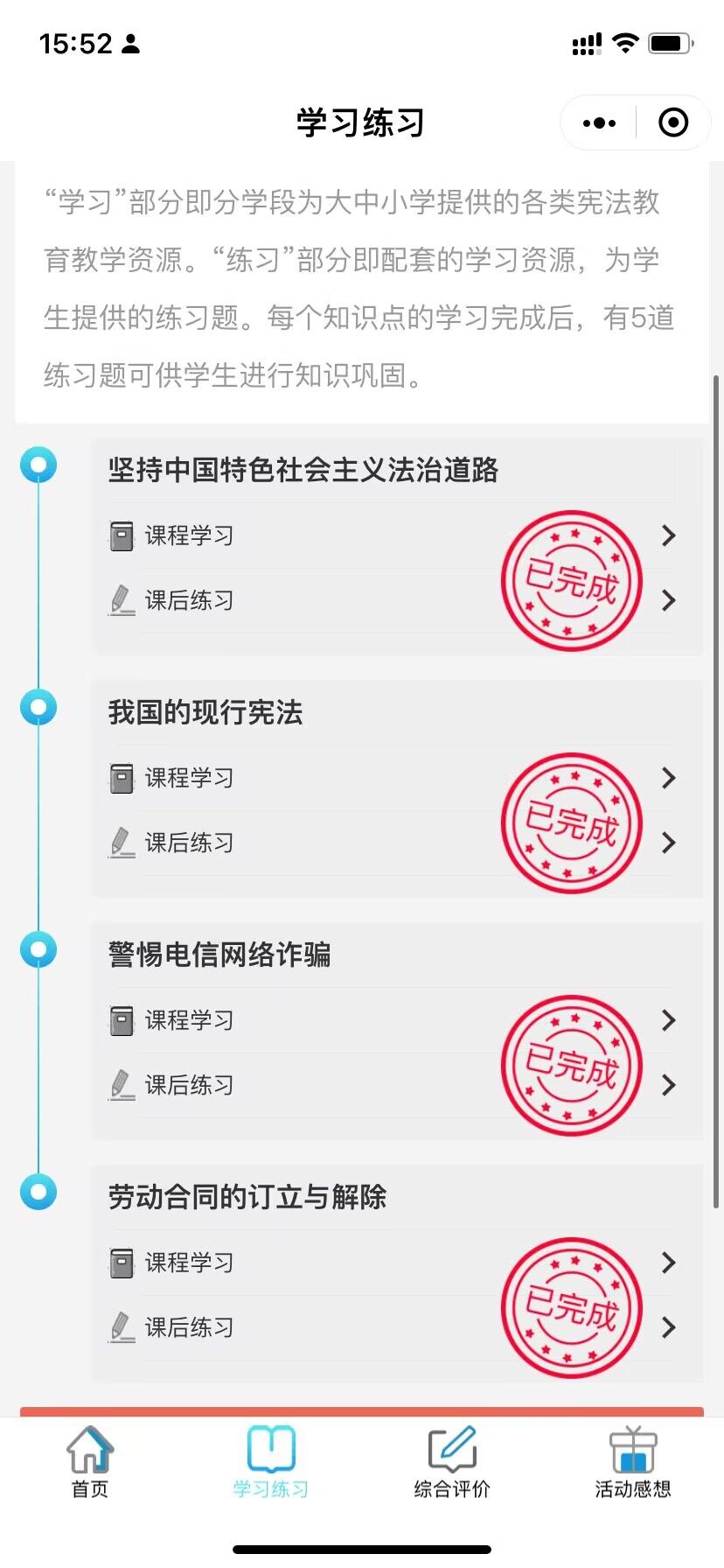 此次宪法线上学习活动延续往年普法网的专栏学习形式,通过围绕“坚持中国特色社会主义法治道路”、“我国的现行宪法”、“警惕电信网络诈骗”及“劳动合同的订立与解除”四个专题内容开展线上学习,内容生动易懂。截至目前,全院共930余名本科生完成宪法知识学习, 同学们纷纷表示更加深刻地体会到宪法的尊严和价值,了解到宪法作为我国根本大法的重要地位,在今后的学习生活中要更加自觉遵纪守法,维护宪法权威!