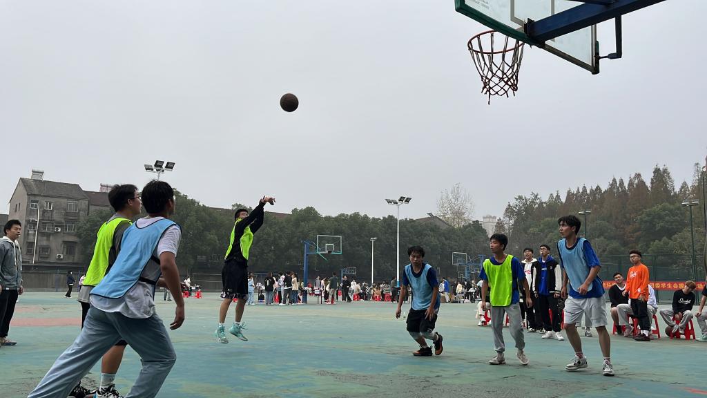赛前,双方队员派出代表猜拳决定发球顺序。哨声响起,现场的氛围逐步攀升,狭路相逢勇者胜,比赛双方很快进入了激烈的角逐。运球、传球、假动作、三步上篮……赛场上,队员们比拼激烈,队员之间默契传球、完美配合引来围观同学一阵阵地喝彩。场外观众为球员加油助力,声音一声比一声高。休息时间,每队派出两名女生投篮助兴,为比赛得分助力。比赛结束后,双方队友握手拥抱,充分展现了“友谊第一,比赛第二”的体育精神。