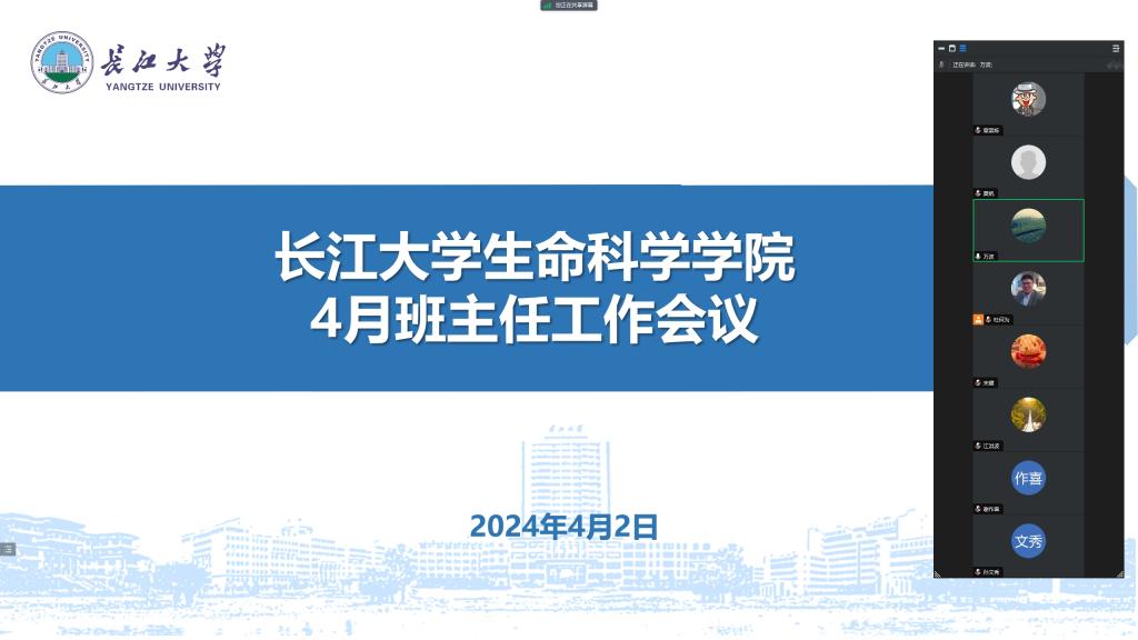 辅导员章崇烁从农科类专场招聘会、学院就业现状及就业指导帮扶三方面进行汇报;辅导员贾雨濛首先围绕组织清明节假期主题教育班会、关于毕业年级学生的管理和关于学生安全隐患综合治理工作进行了清明节前后学生日常教育管理重点工作的提示,号召班主任要加强学生防校园欺凌专项教育、交通消防及食品安全教育、防溺水、防诈骗教育和请销假、外宿及晚归等纪律观念教育。其次,为各位班主任介绍了即将举办的师生同“餐”,共享“食”光活动方案。