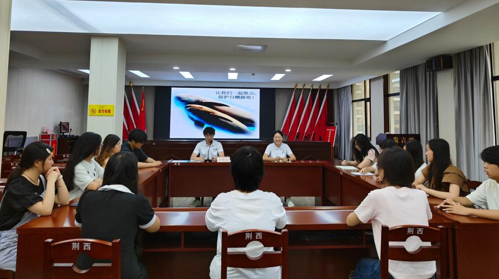 长江江豚是世界上唯一的淡水江豚。它性情活泼,是嘴角含笑的生灵,因此被称为“微笑天使”。7月12日上午11时,实践队赶往石首天鹅洲江豚自然保护区,调研江豚保护情况。实践队员首先观看了江豚保护纪录片,然后参观了江豚科普馆。通过纪录片和讲解员对标本的讲解,实践队员慢慢走近江豚,对江豚的身体结构、生活习性和生态位有了初步的认识。讲解员讲道:“通过保护区上下齐心的努力,江岸在变绿,江水在变清,一度成为濒危物种的江豚如今频频露脸。”听到这里,实践队员们无不心潮澎湃,期待着与“微笑天使”们见上一面。