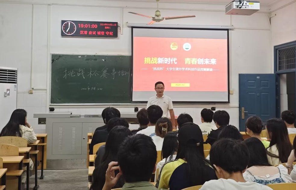 9月11日晚,李敏面向全院学生骨干解读“挑战杯”竞赛。首先,他介绍了“挑战杯”竞赛的影响力、类别和赛事安排,回顾了我校近几年的参赛情况和获奖情况。随后,李敏为大家进行了“大挑”校赛解读,具体介绍了“大挑”的参赛资格,参赛作品的分类以及申报要求,参赛的时间安排,让大家加深对赛程的了解。李敏以曾经指导的参赛作品《信·荆楚》为典型案例,通过视频和讲解的方式,让同学们更加直观地了解了参赛作品的创作过程和研究成果。
