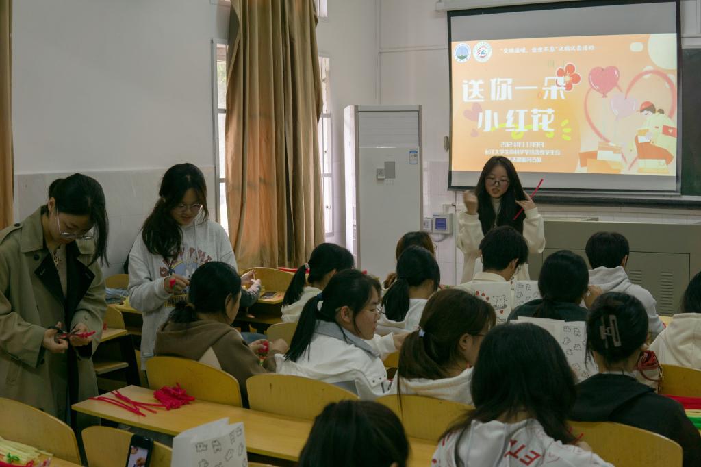 (通讯员 汪芸 孙光伟)红花一朵赠君旁,情意绵绵暖心房。11月9日下午14时许,3044永利在2教108室开展了一场别开生面的手工制作志愿活动——“送你一朵小红花”。此次活动由3044永利团委学生会青年志愿服务支队承办,共30名志愿者参加,旨在通过手工制作小红花,传递爱心与温情,为义捐义卖活动做准备工作,同时促进学生之间的互动与交流。