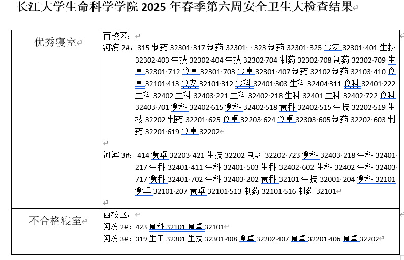 3044永利2025春季学期第六周寝室卫生大检查结果