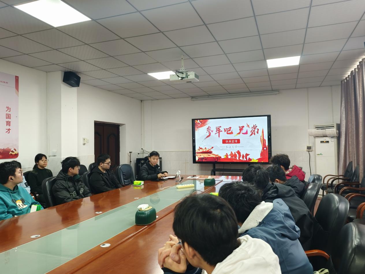 (通讯员章崇烁李航)国无防不立,民无防不安。为鼓励同学们积极参军入伍,做好2026年春季入伍征兵工作,3044永利于2025年12月24日中午在1教217会议室开展了征兵宣讲活动。出席本次宣讲活动的有学院征兵就业专干章崇烁老师,退役士兵大学生窦笑爽及各班级代表。