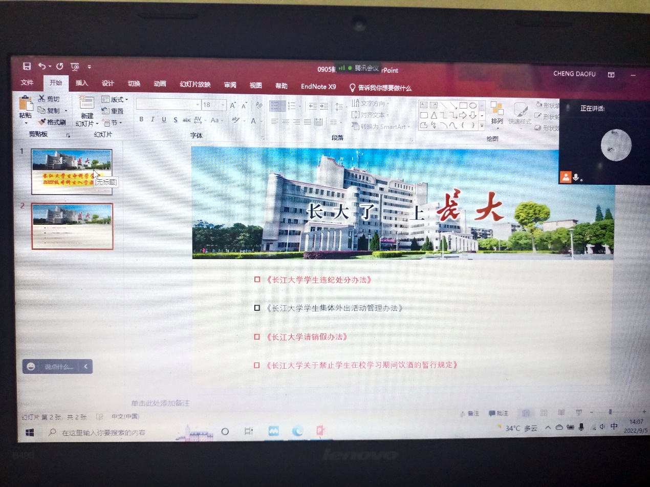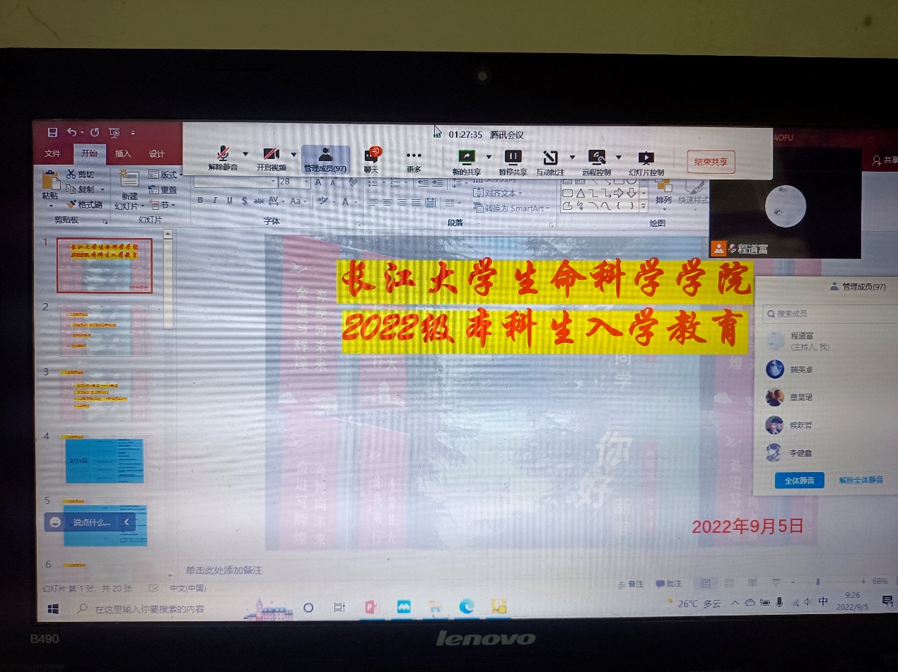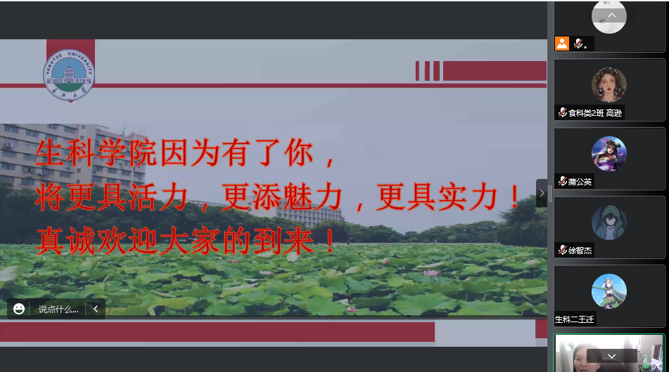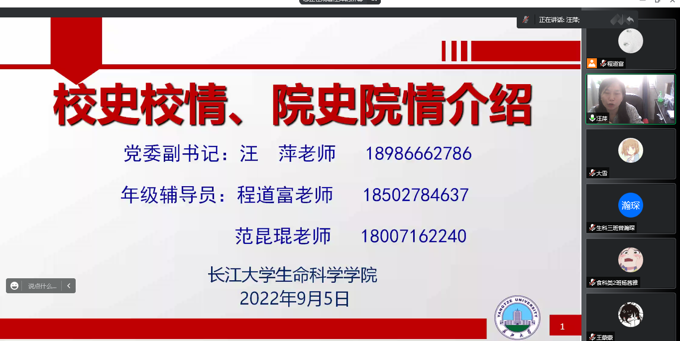 (通讯员 程道富 汪萍)新生入学教育是大学教育的起点,是整个大学学习阶段的关键时期。为帮助新生适应校园生活,加快建立学院-学生之间的情感联结,培养新生遵守校纪校规,树立规矩意识的习惯,生科学院于2022年9月5日通过在线会议平台,组织开展针对我院全体新生在内的入学集中线上教育工作。