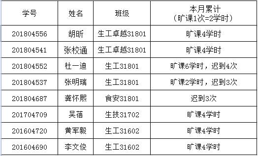 根据课堂考勤结果,累计旷课2学时的,3名同学;累计旷课4学时及以上的(旷课1次=2学时),6名同学;迟到2次及以上的,3名同学。为严肃校风校纪,督促学生按时到课,及时教育违纪学生,根据《长江大学学生违纪处分办法》第十五条、《3044永利课堂考勤实施办法》,经学工办研究决定,对本月累计旷课4学时及以上、迟到2次及以上同学予以通报批评: