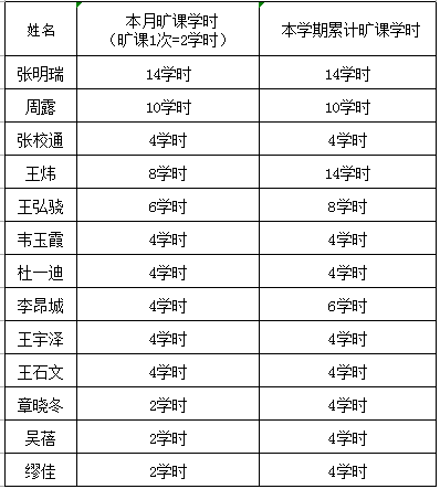 根据课堂考勤结果,累计旷课2学时的,13名同学;累计旷课4学时及以上的(旷课1次=2学时),10名同学。严肃校风校纪,督促学生按时到课,及时教育违纪学生,根据《长江大学学生违纪处分办法》第十五条、《3044永利课堂考勤实施办法》,经学工办研究决定,对旷课4学时以上同学予以通报批评: