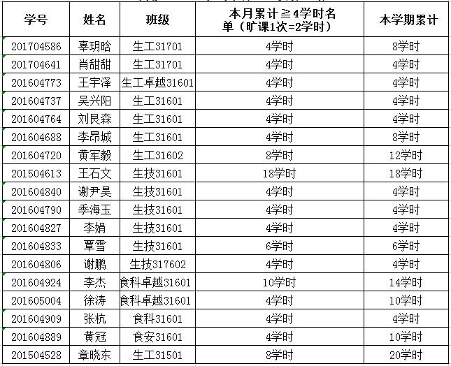 根据课堂考勤结果,累计旷课2学时的,20名同学;累计旷课4学时及以上的(旷课1次=2学时),18名同学;为严肃校风校纪,督促学生按时到课,及时教育违纪学生,根据《长江大学学生违纪处分办法》第十五条、《3044永利课堂考勤实施办法》,经学工办研究决定,对本月累计旷课4学时以上的同学予以通报批评: