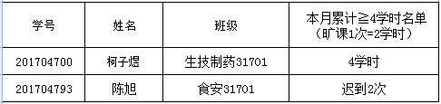根据课堂考勤结果,累计旷课2学时的,3名同学;累计旷课4学时及以上的(旷课1次=2学时),1名同学;迟到2次及以上的,1名同学。为严肃校风校纪,督促学生按时到课,及时教育违纪学生,根据《长江大学学生违纪处分办法》第十五条、《3044永利课堂考勤实施办法》,经学工办研究决定,对本月累计旷课4学时及以上、迟到2次及以上同学予以通报批评: