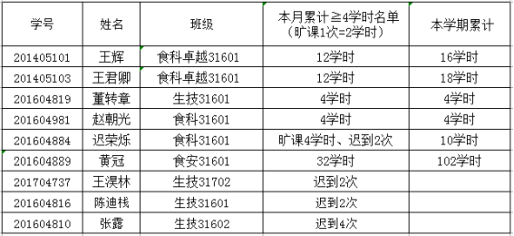 根据课堂考勤结果,累计旷课2学时的,16名同学;累计旷课4学时及以上的(旷课1次=2学时),6名同学;迟到46人次。严肃校风校纪,督促学生按时到课,及时教育违纪学生,根据《长江大学学生违纪处分办法》第十五条、《3044永利课堂考勤实施办法》,经学工办研究决定,对本月累计旷课4学时以上,迟到2次及以上的同学予以通报批评:
