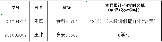 根据课堂考勤结果,累计旷课2学时的,16名同学;累计旷课4学时及以上的(旷课1次=2学时),2名同学。严肃校风校纪,督促学生按时到课,及时教育违纪学生,根据《长江大学学生违纪处分办法》第十五条、《3044永利课堂考勤实施办法》,经学工办研究决定,对本月累计旷课4学时以上同学予以通报批评: